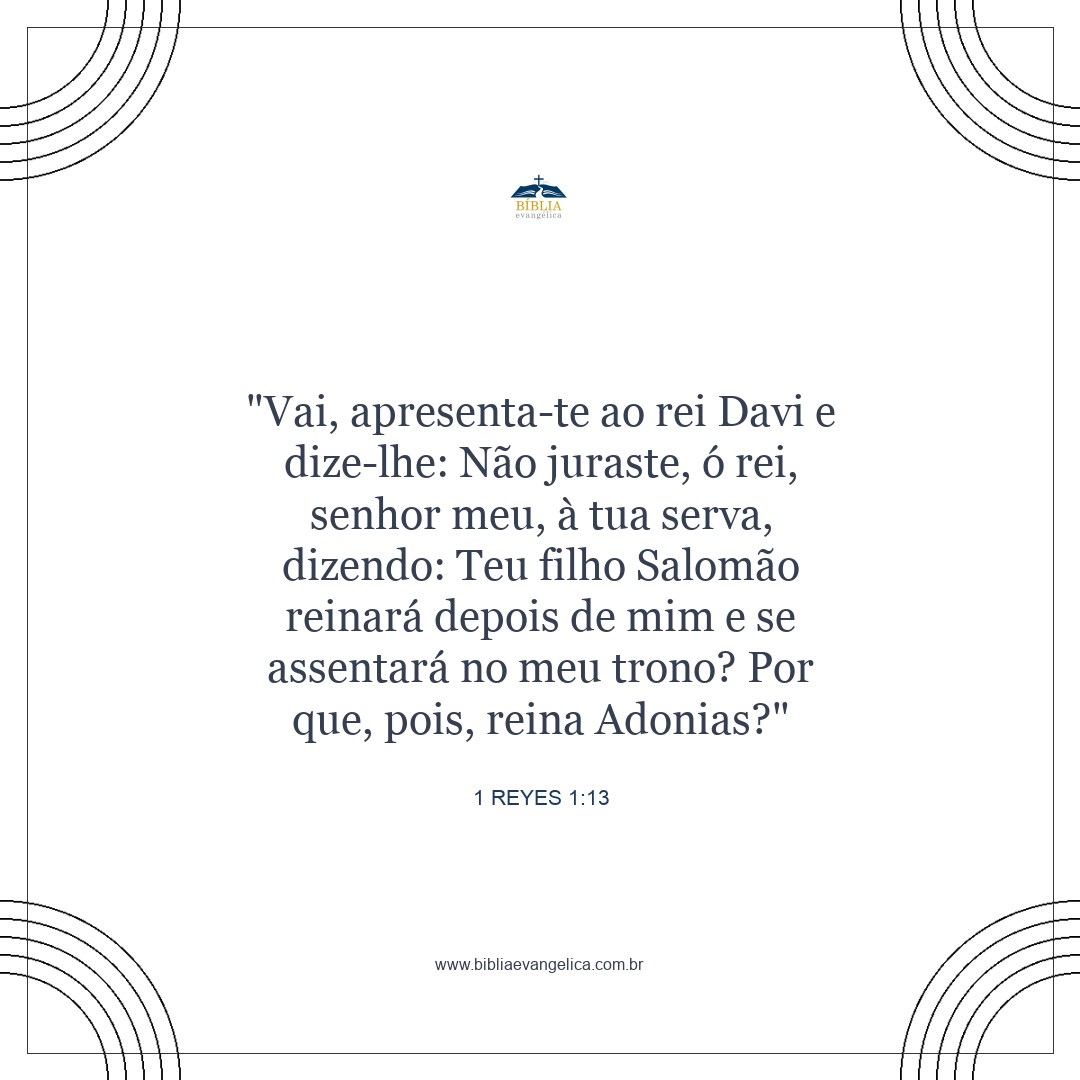 Vá perguntar ao rei Davi: Ó rei, meu senhor, não juraste a esta tua serva, prometendo: ´Tenha certeza que o seu filho Salomão me sucederá como rei, e se assentará no meu trono? ` Por que foi então, que Adonias se tornou rei?