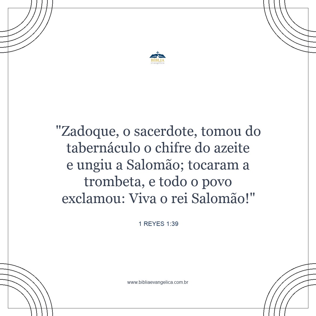 O sacerdote Zadoque pegou na Tenda o chifre com óleo e ungiu Salomão. Então tocaram a trombeta e todo o povo gritou: "Viva o rei Salomão! "