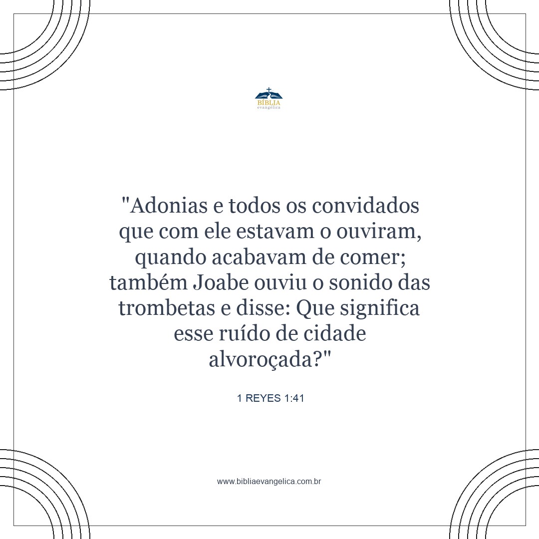 Adonias e todos os seus convidados souberam disso quando estavam terminando o banquete. Ao ouvir o toque da trombeta, Joabe perguntou: "O que significa esta gritaria, esse alvoroço na cidade? "