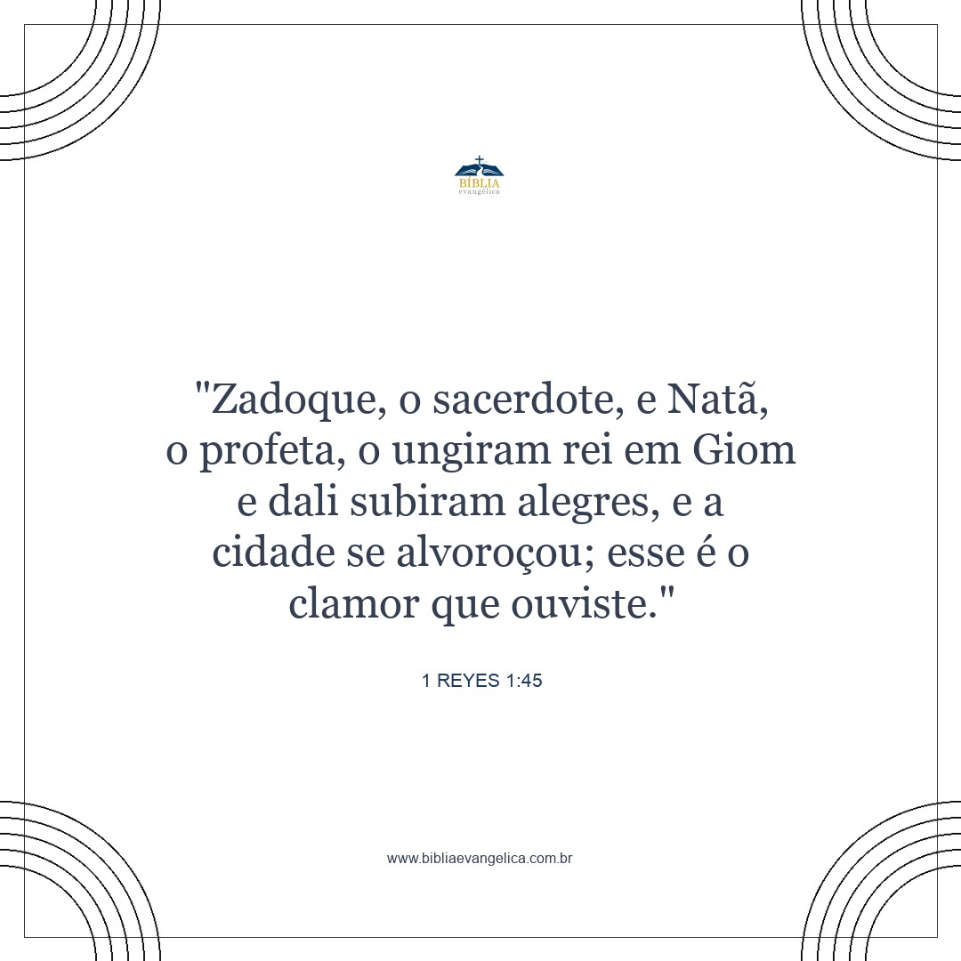 Depois o sacerdote Zadoque e o profeta Natã o ungiram rei em Giom. De lá eles saíram comemorando, e a cidade está alvoroçada. É esse o barulho que vocês ouvem.