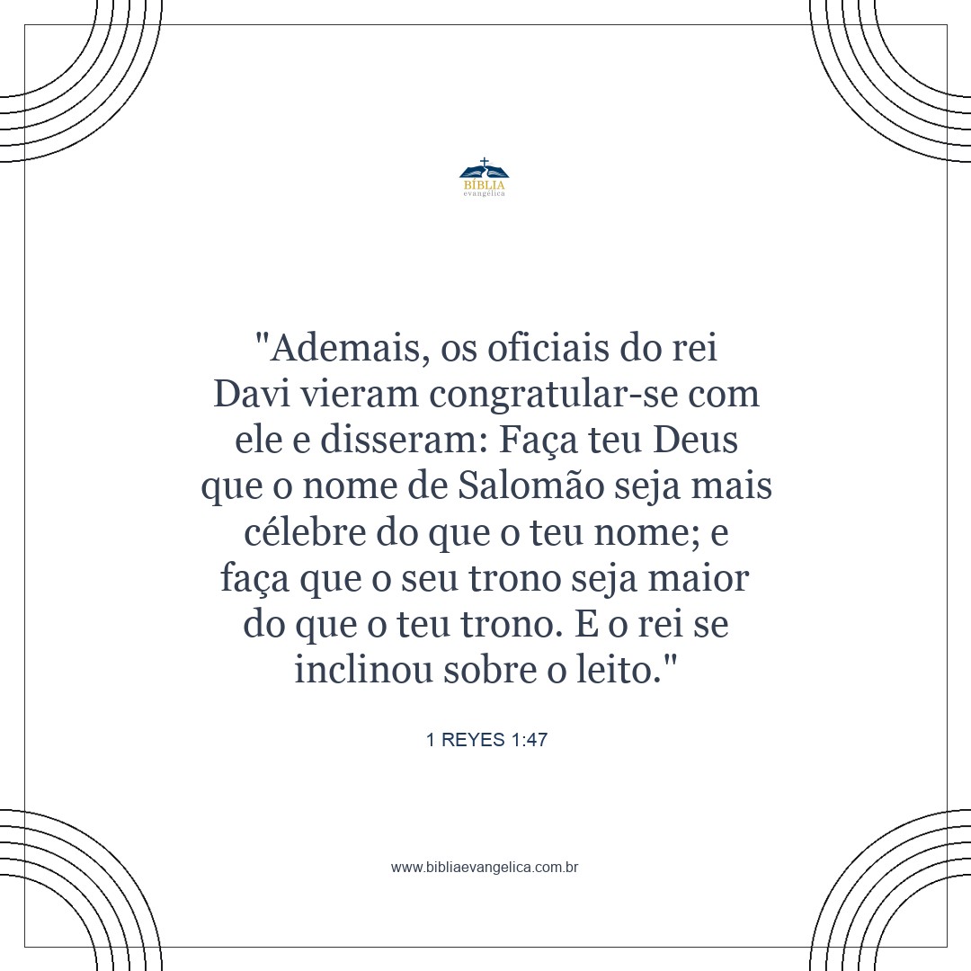 Até mesmo os oficiais do rei foram cumprimentar Davi, o nosso rei e senhor, dizendo: ´Que o teu Deus torne o nome de Salomão mais famoso que o teu, e o seu reinado mais glorioso do que o teu! ` E o rei curvou-se reverentemente em sua cama,
