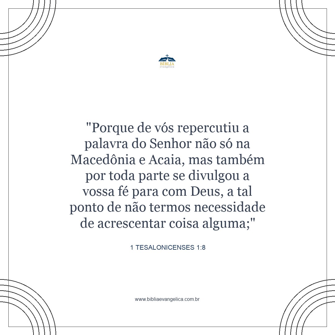 Porque, partindo de vocês, propagou-se a mensagem do Senhor na Macedônia e na Acaia. Não somente isso, mas também por toda parte tornou-se conhecida a fé que vocês têm em Deus. O resultado é que não temos necessidade de dizer mais nada sobre isso,