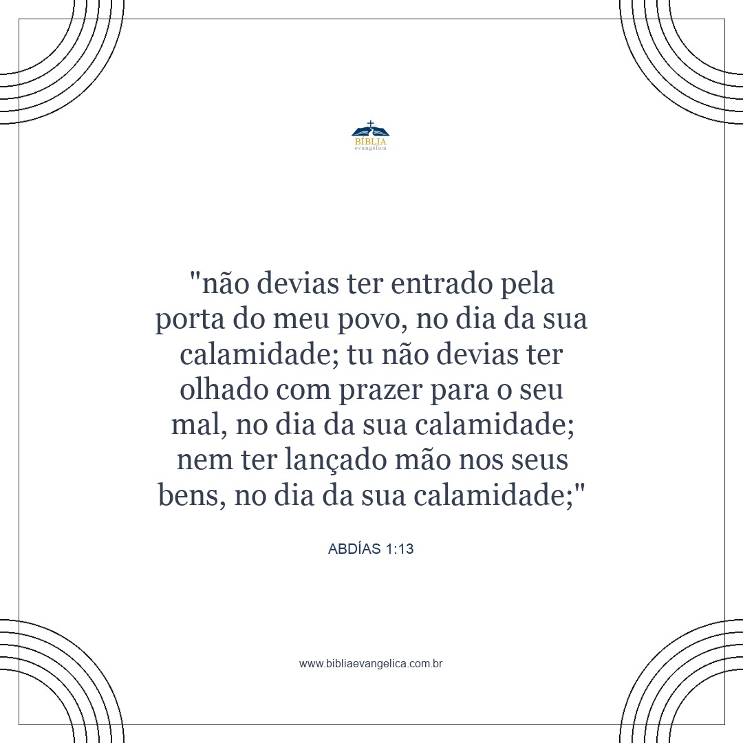 Não devia ter entrado pelas portas do meu povo no dia da sua calamidade; nem devia ter ficado alegre com o sofrimento dele no dia da sua ruína; nem ter roubado a riqueza dele no dia da sua desgraça.