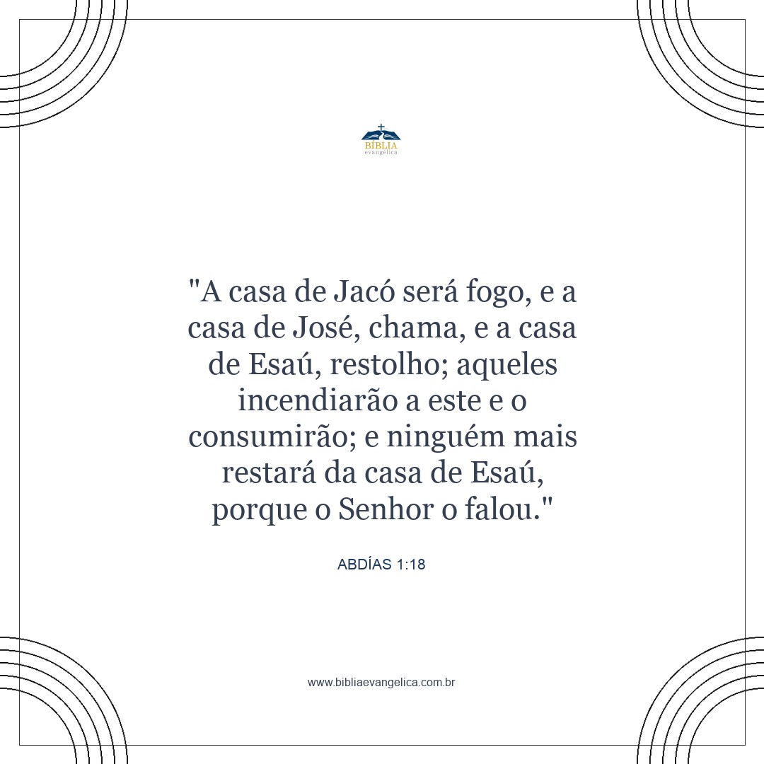 A descendência de Jacó será um fogo, e a de José uma chama; a descendência de Esaú será a palha. Eles a incendiarão e a consumirão. Não haverá sobreviventes da descendência de Esaú`, declara o SENHOR.