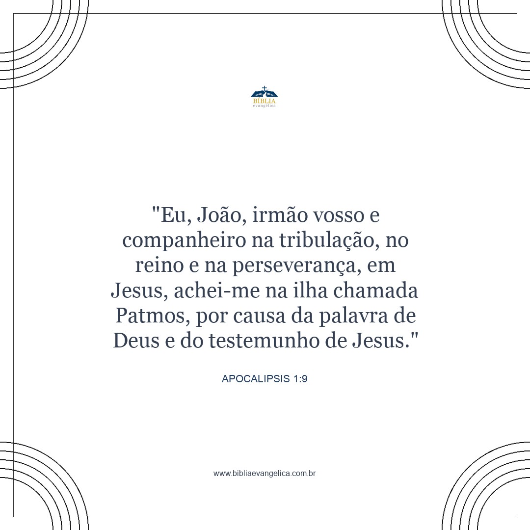 Eu, João, irmão e companheiro de vocês no sofrimento, no Reino e na perseverança em Jesus, estava na ilha de Patmos, por causa da palavra de Deus e do testemunho de Jesus.