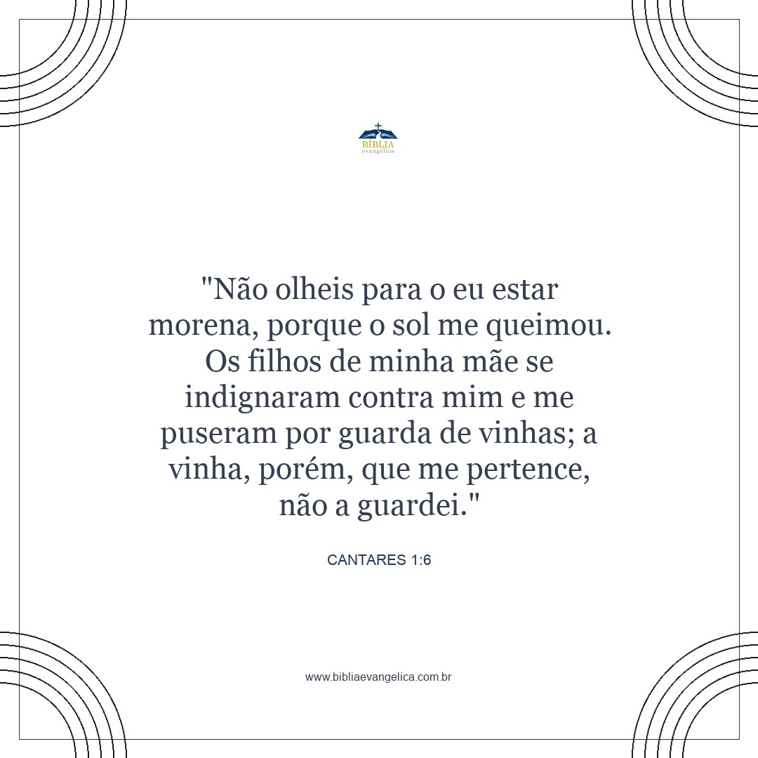 Não me fiquem olhando assim porque estou escura; foi o sol que me queimou a pele. Os filhos de minha mãe zangaram-se comigo e fizeram-me tomar conta das vinhas; da minha própria vinha, porém, eu não pude cuidar.