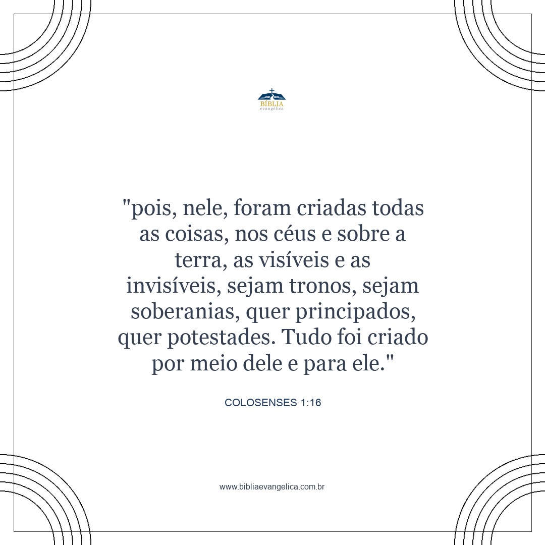 pois nele foram criadas todas as coisas nos céus e na terra, as visíveis e as invisíveis, sejam tronos ou soberanias, poderes ou autoridades; todas as coisas foram criadas por ele e para ele.