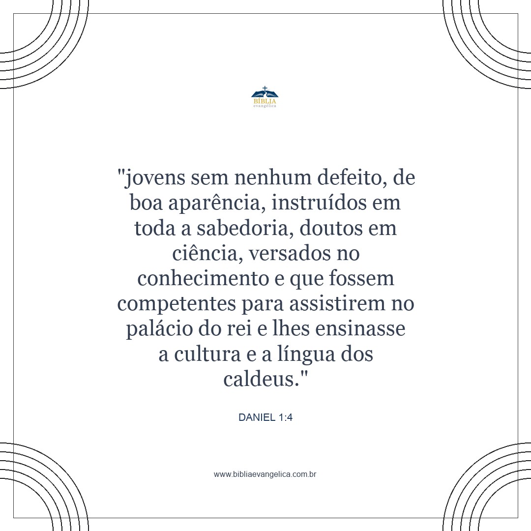 jovens sem defeito físico, de boa aparência, cultos, inteligentes, que dominassem os vários campos do conhecimento e fossem capacitados para servir no palácio do rei. Ele devia ensinar-lhes a língua e a literatura dos babilônios.