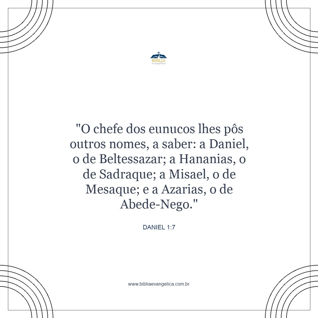 O chefe dos oficiais deu-lhes novos nomes: a Daniel deu o nome de Beltessazar; a Hananias, Sadraque; a Misael, Mesaque; e a Azarias, Abede-Nego.