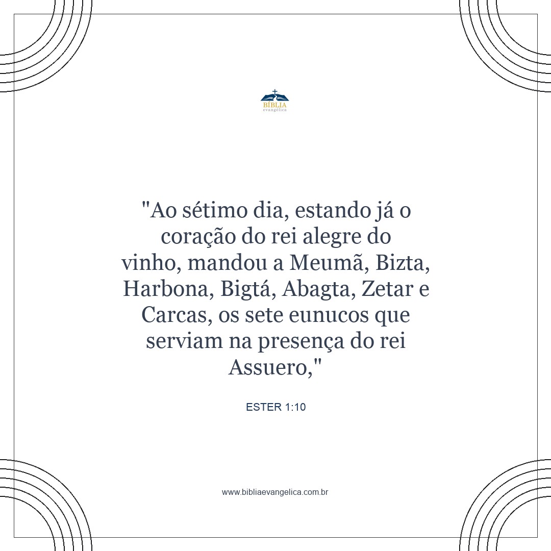Ao sétimo dia, quando o rei Xerxes já estava alegre por causa do vinho, ordenou que os sete oficiais que o serviam: Meumã, Bizta, Harbona, Bigtá, Abagta, Zetar e Carcas,