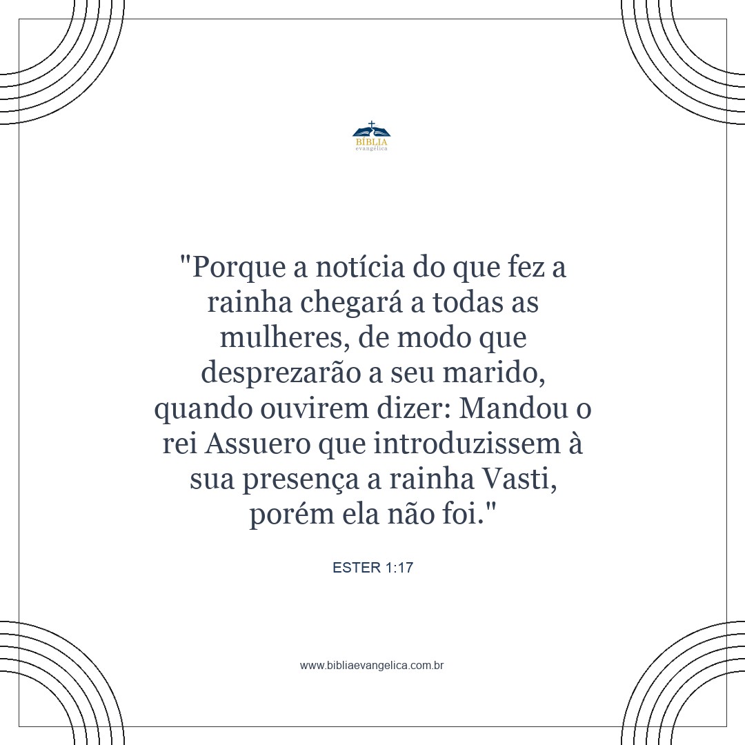 pois a conduta da rainha se tornará conhecida entre todas as mulheres, e assim também elas desprezarão seus maridos e dirão: ´O rei Xerxes ordenou que a rainha Vasti fosse à sua presença, mas ela não foi`.