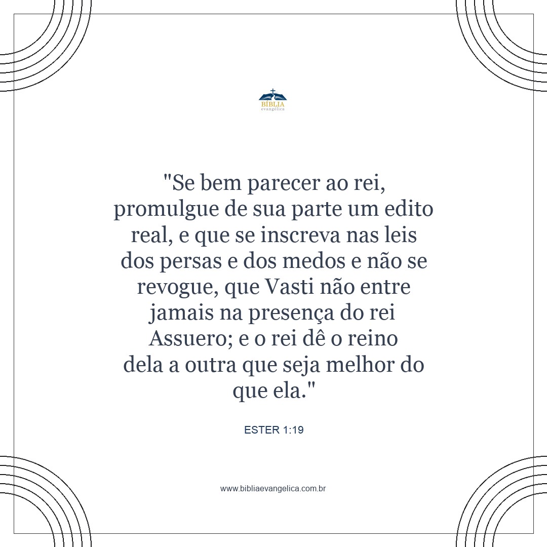 "Por isso, se for do agrado do rei, que ele emita um decreto real, e que seja escrito na lei da Pérsia e da Média, que não se pode revogar, determinando que Vasti nunca mais compareça na presença do rei Xerxes. Também dê o rei a sua posição de rainha a outra que seja melhor do que ela.