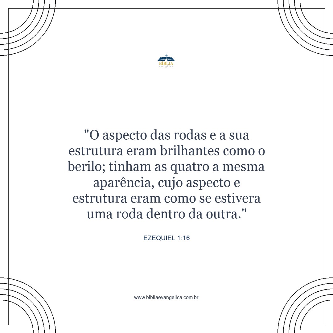 Esta era a aparência das rodas e a sua estrutura: Reluziam como o berilo; e as quatro tinham aparência semelhante. Cada roda parecia estar entrosada na outra.