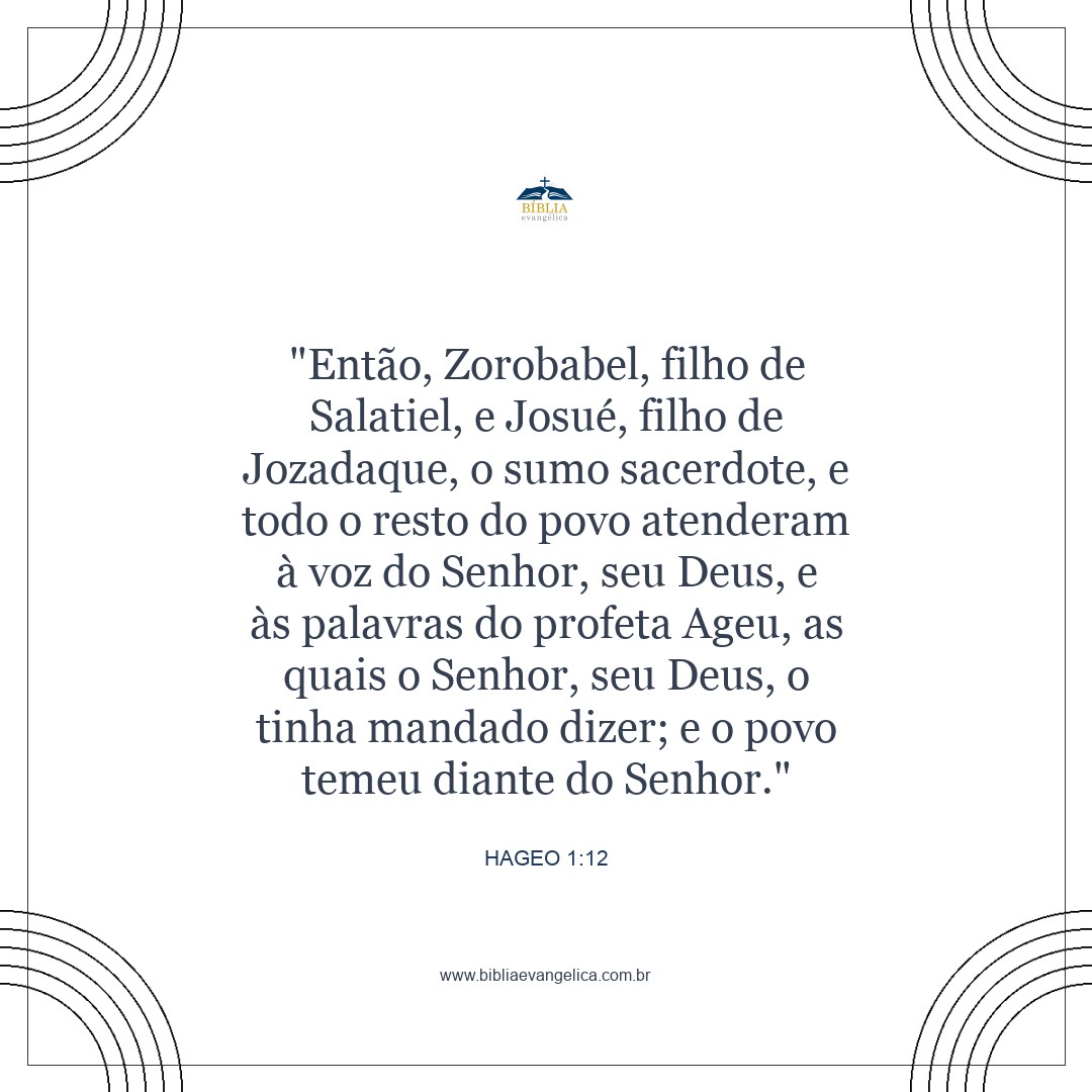 Zorobabel, filho de Sealtiel, o sumo sacerdote Josué, filho de Jeozadaque, e todo o restante do povo obedeceram à voz do Senhor, o seu Deus, por causa das palavras do profeta Ageu, a quem o Senhor, o seu Deus, enviara. E o povo temeu ao Senhor.
