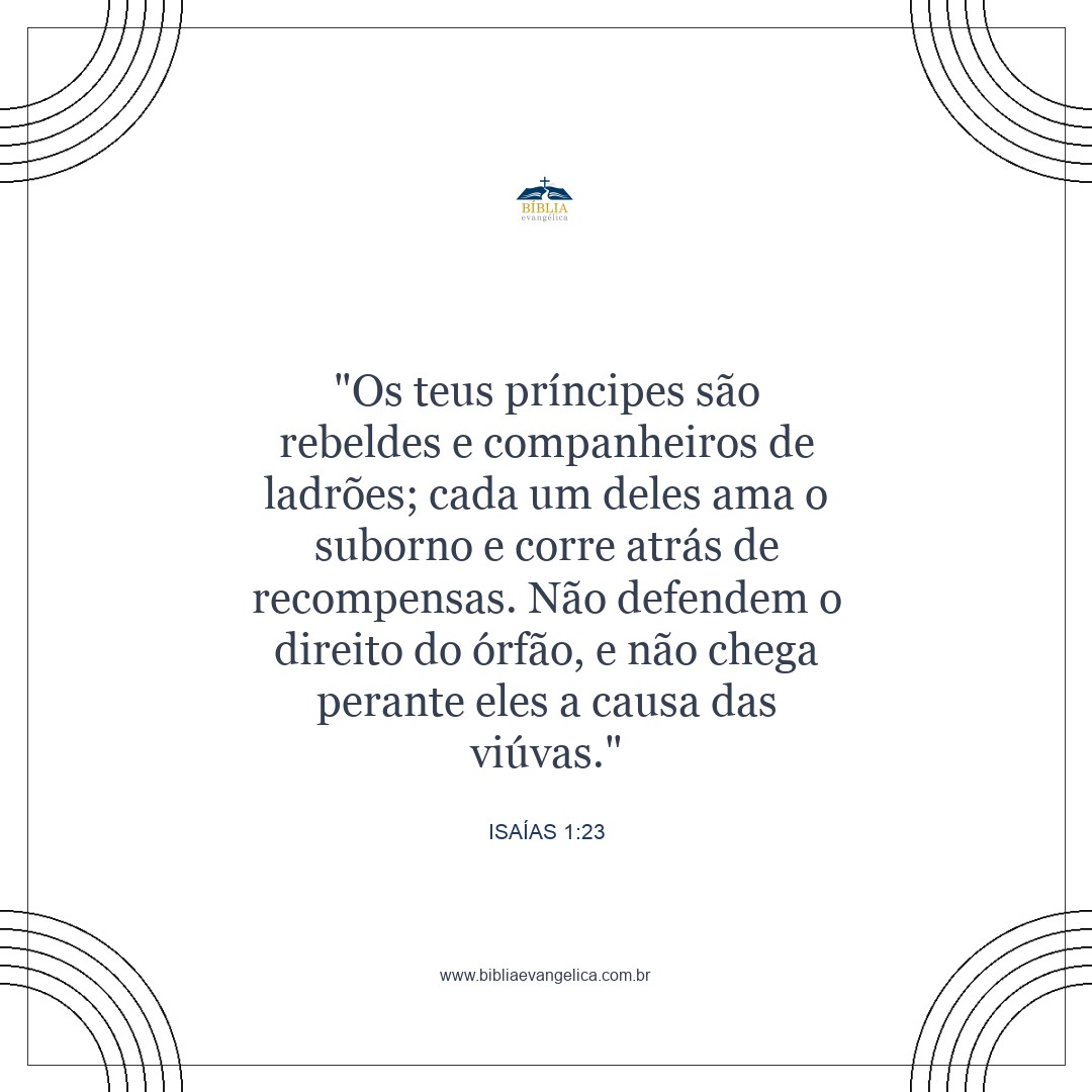 Seus líderes são rebeldes, amigos de ladrões; todos eles amam o suborno e andam atrás de presentes. Eles não defendem os direitos do órfão, e não tomam conhecimento da causa da viúva.