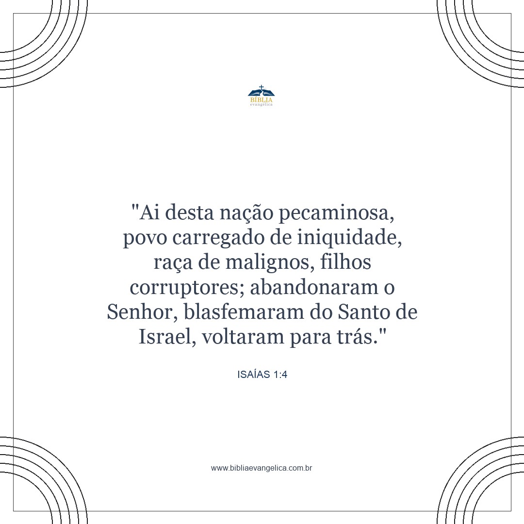 Ah, nação pecadora, povo carregado de iniqüidade! Raça de malfeitores, filhos dados à corrupção! Abandonaram o Senhor; desprezaram o Santo de Israel e o rejeitaram.