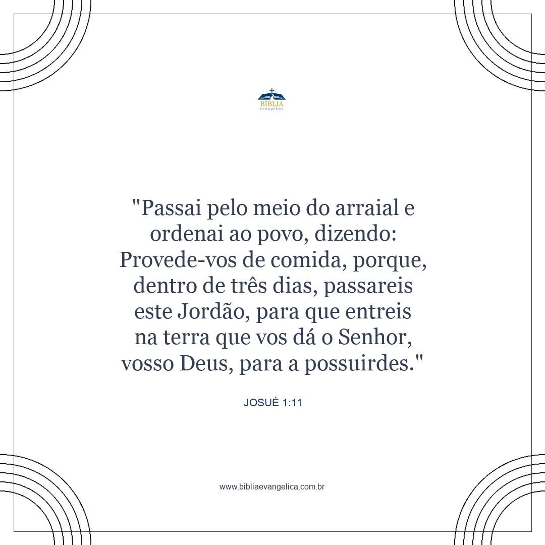 "Percorram o acampamento e ordenem ao povo que preparem as provisões. Daqui a três dias vocês atravessarão o Jordão neste ponto para entrar e tomar posse da terra que o Senhor, o seu Deus, lhes dá".