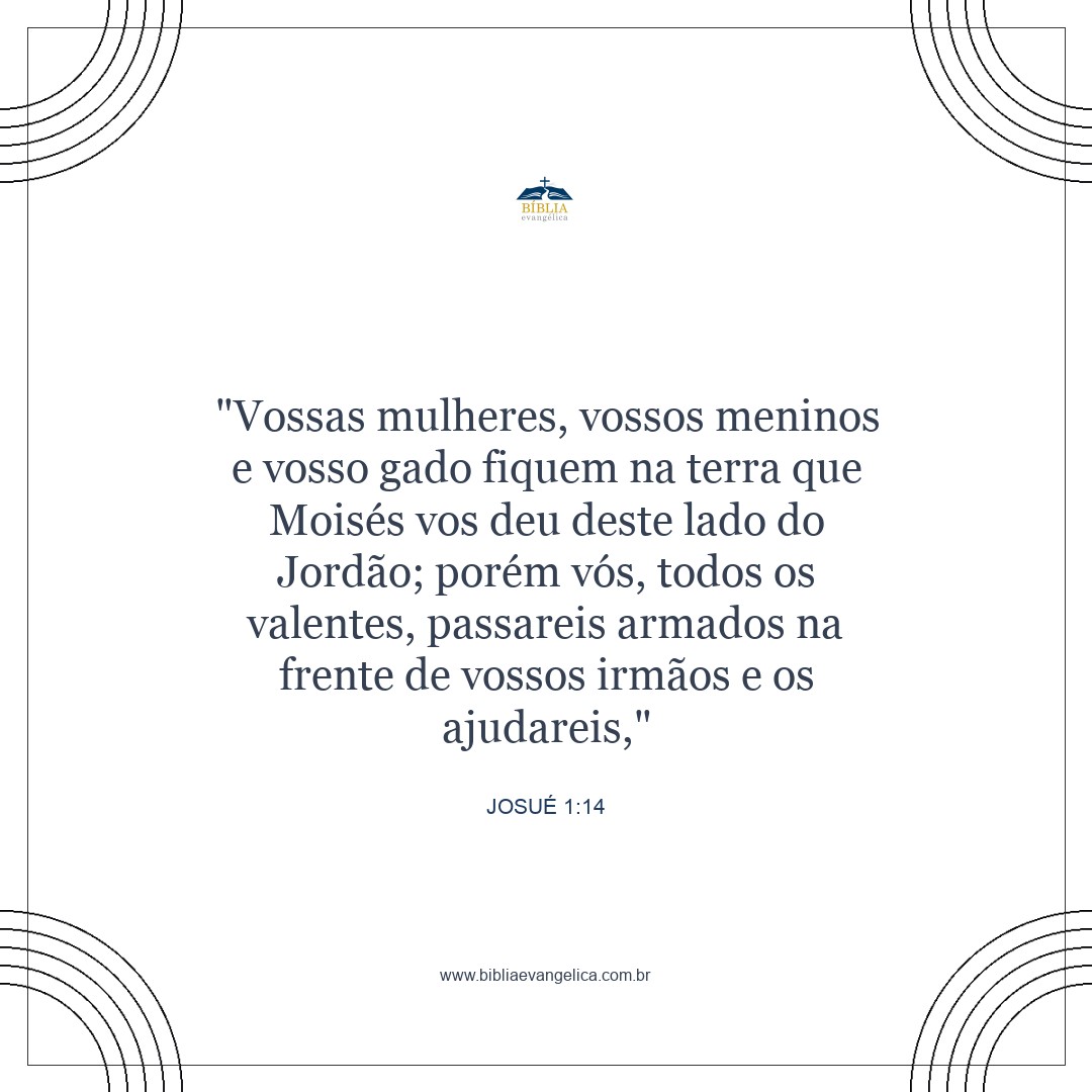 ´As suas mulheres, os seus filhos e os seus rebanhos poderão ficar na terra que Moisés lhes deu a leste do Jordão, mas todos os homens de guerra, preparados para lutar, atravessarão à frente dos seus irmãos israelitas`. Vocês os ajudarão