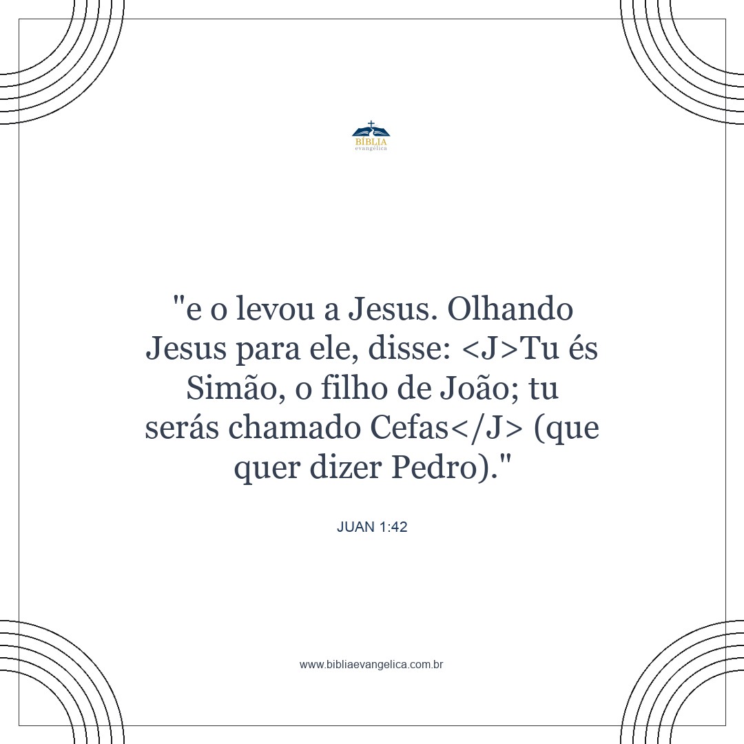 E o levou a Jesus. Jesus olhou para ele e disse: "Você é Simão, filho de João. Será chamado Cefas" ( que significa Pedro ).