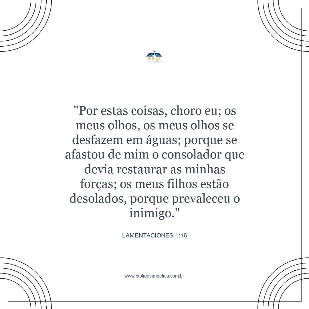 É por isso que eu choro; as lágrimas inundam os meus olhos. Ninguém está por perto para consolar-me, não há ninguém que restaure o meu espírito. Meus filhos estão desamparados porque o inimigo prevaleceu. "