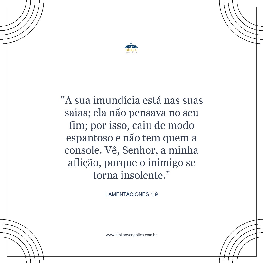 Sua impureza prende-se às suas saias; ela não esperava que chegaria o seu fim. Sua queda foi surpreendente; ninguém veio consolá-la. "Olha, Senhor, para a minha aflição, pois o inimigo triunfou. "