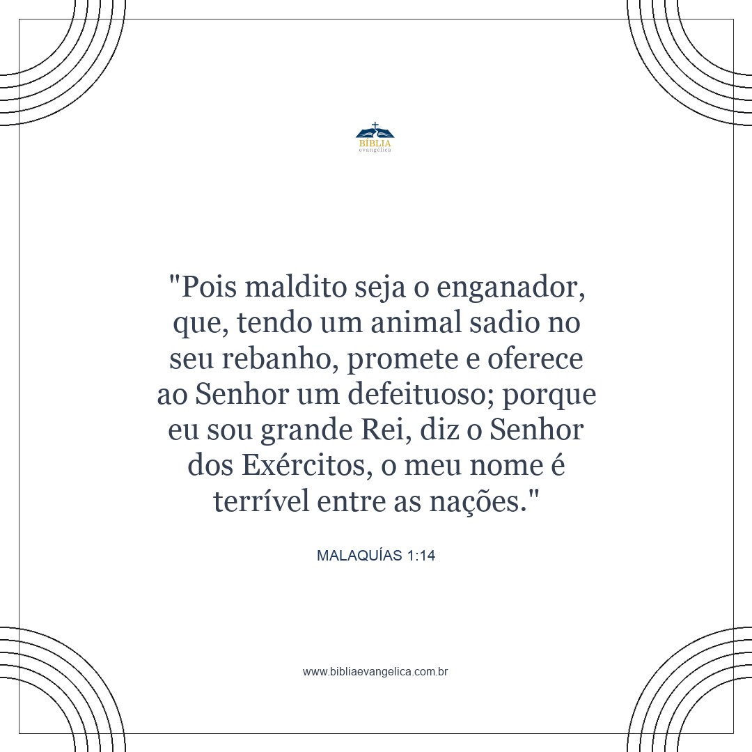 "Maldito seja o enganador que, tendo no rebanho um macho sem defeito, promete oferecê-lo e depois sacrifica um animal defeituoso", diz o Senhor dos Exércitos; "pois eu sou um grande rei, e o meu nome é temido entre as nações. "