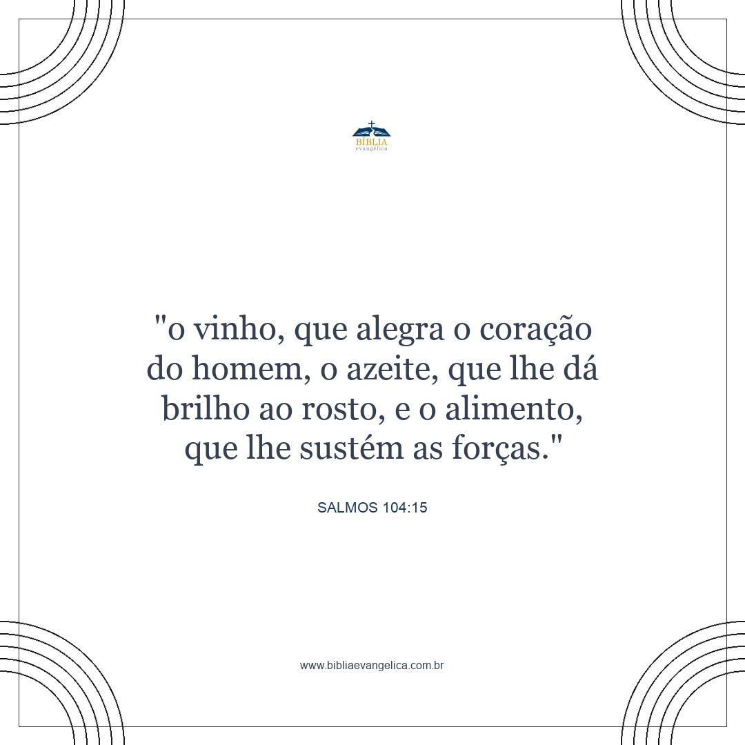 o vinho, que alegra o coração do homem; o azeite, que faz brilhar o rosto, e o pão que sustenta o seu vigor.