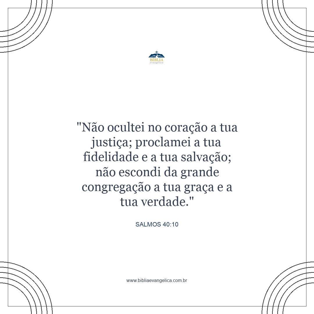 Não oculto no coração a tua justiça; falo da tua fidelidade e da tua salvação. Não escondo da grande assembléia a tua fidelidade e a tua verdade.